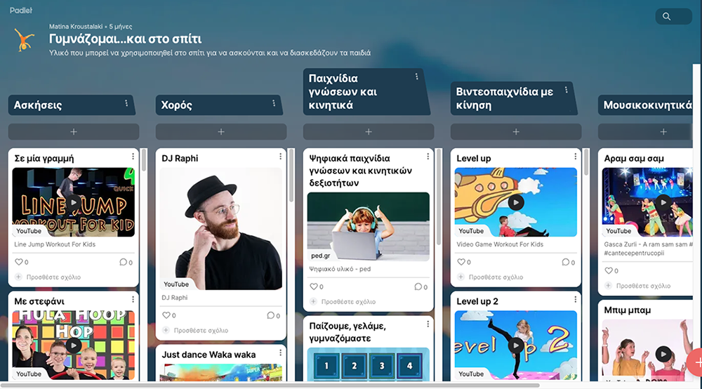Δημιουργήσαμε έναν διαδικτυακό χώρο (Padlet) με υλικό που μπορεί να χρησιμοποιηθεί εύκολα και στο σπίτι. Ο σύνδεσμος του Padlet μπορεί να σταλεί στους γονείς, δίνοντάς τους τη δυνατότητα να αξιοποιήσουν το υλικό ανάλογα με τον χώρο και τον χρόνο που διαθέτουν. Αυτός ο διαδικτυακός χώρος προσφέρει μία εξαιρετική ευκαιρία για τα παιδιά να παραμείνουν ενεργά, ιδιαίτερα όταν οι συνθήκες δεν επιτρέπουν φυσική άσκηση σε εξωτερικούς χώρους (π.χ. λόγω κακοκαιρίας ή περιορισμένου χρόνου).